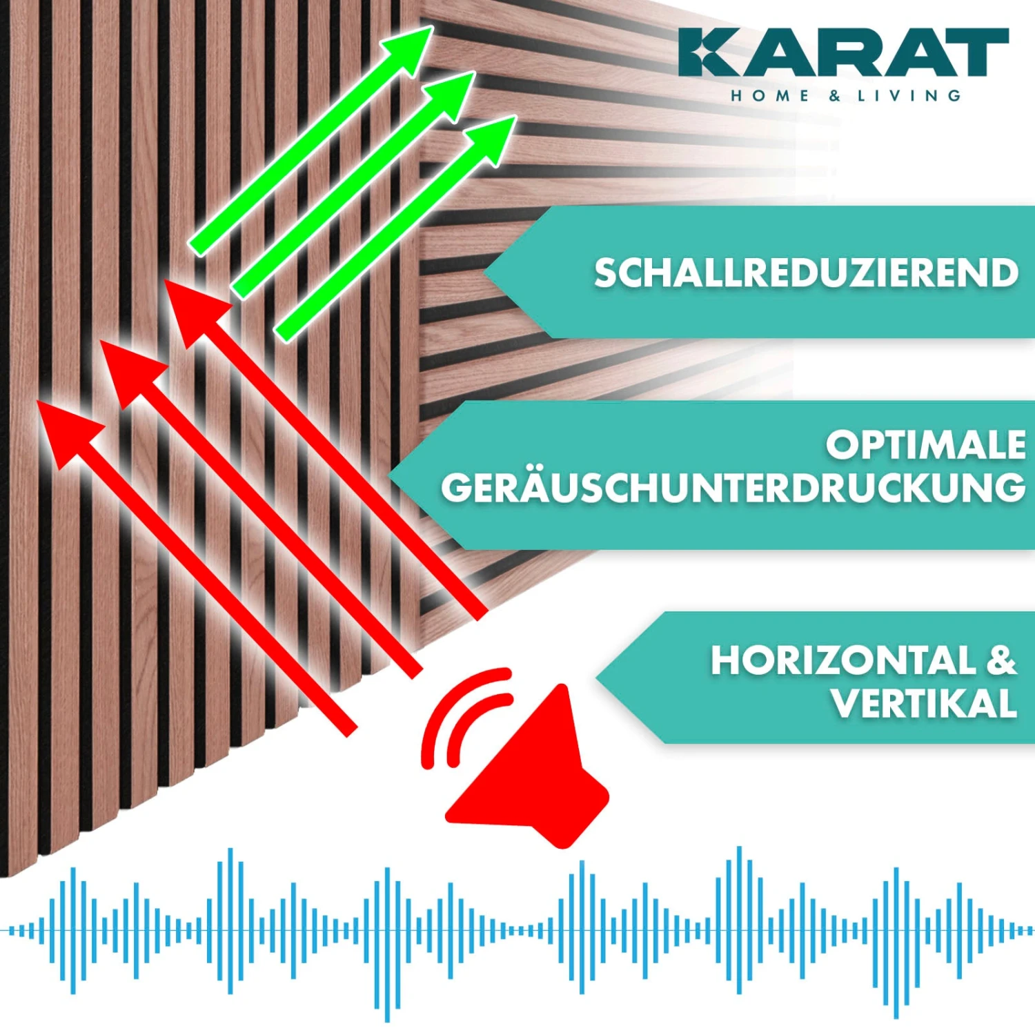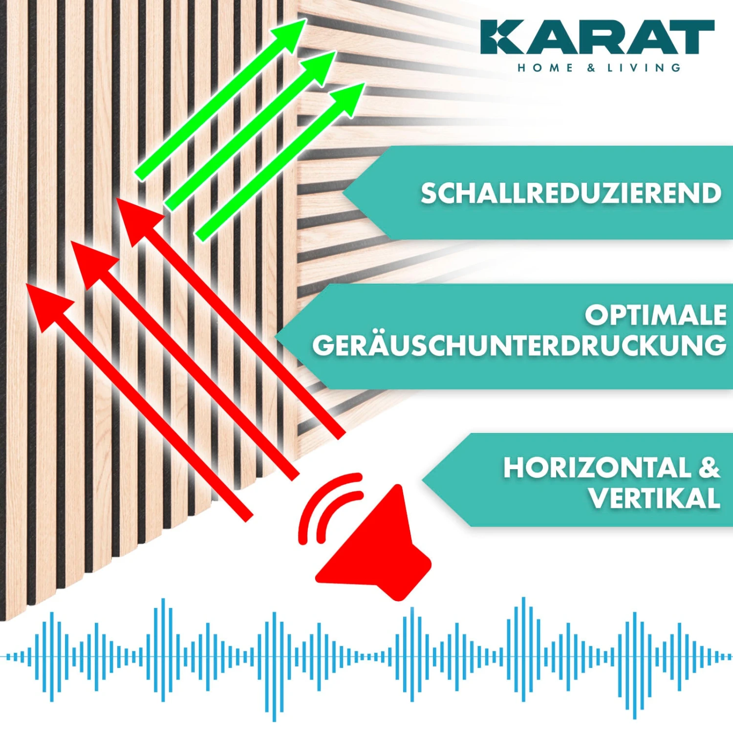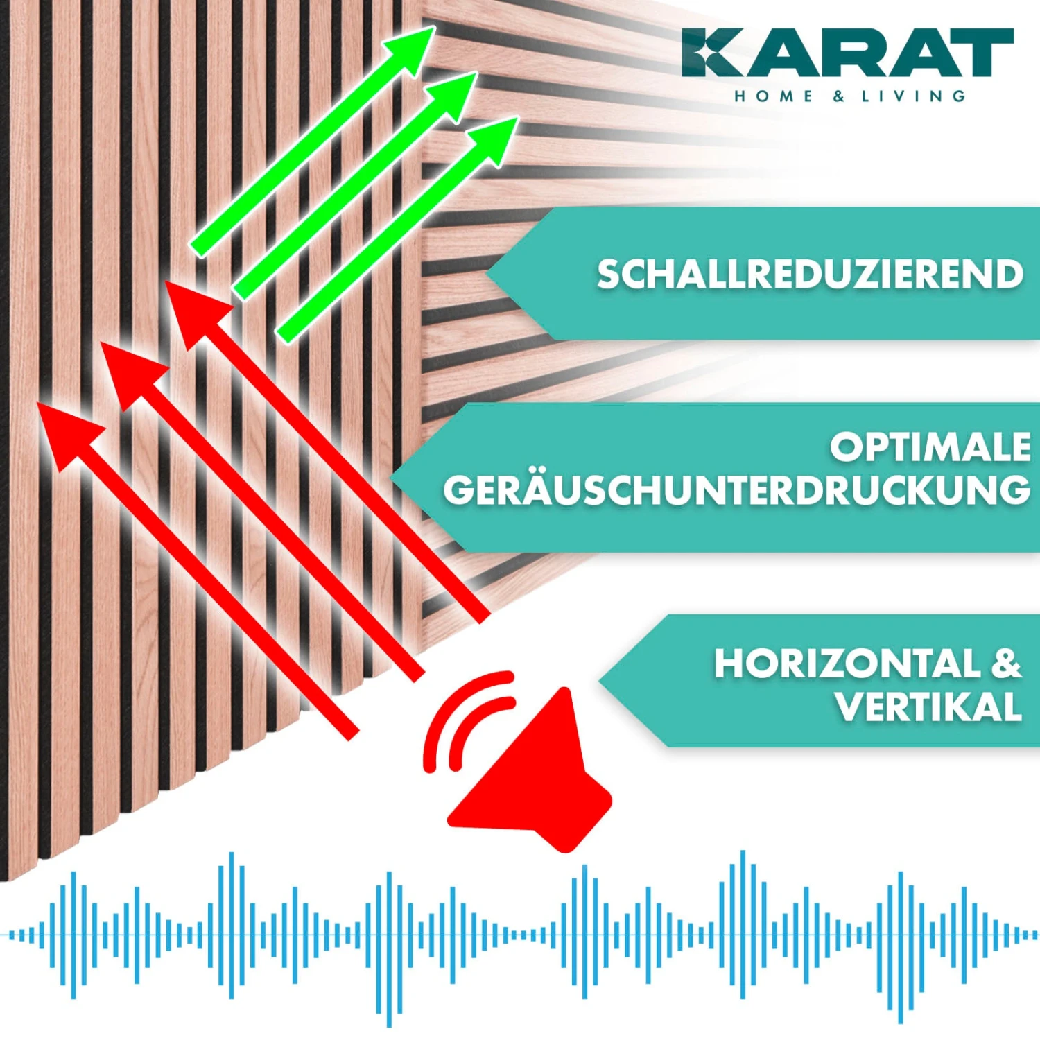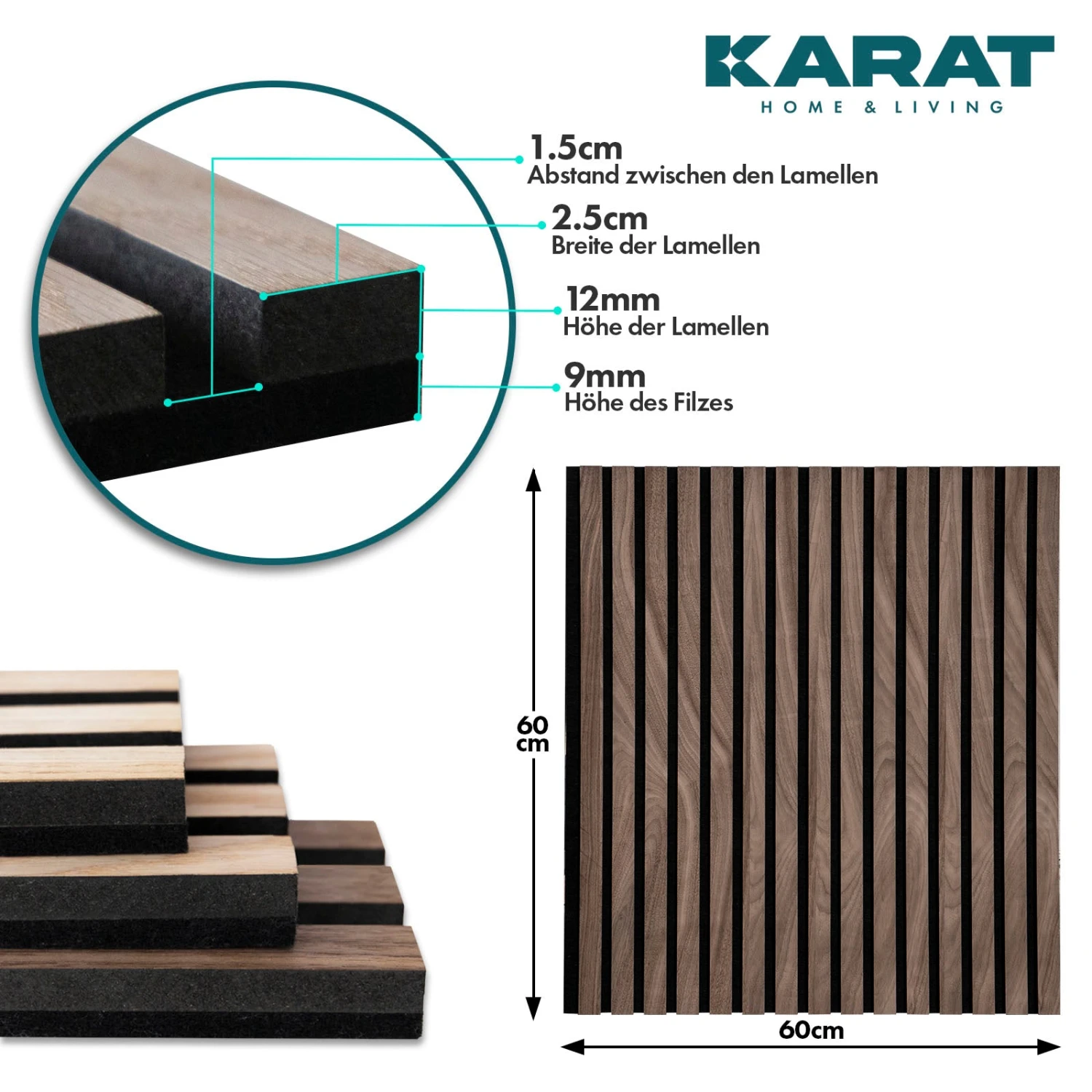 Die Breite der Lamellen beträgt 2,7 cm und der Abstand zwischen den Lamellen liegt bei 1,3 cm, was eine optimale Schallabsorption ermöglicht. Die Plattendicke des Paneels beträgt 2,1 cm, dies gewährleistet eine effektive Schallreduzierung und verbessert die Raumakustik deutlich.