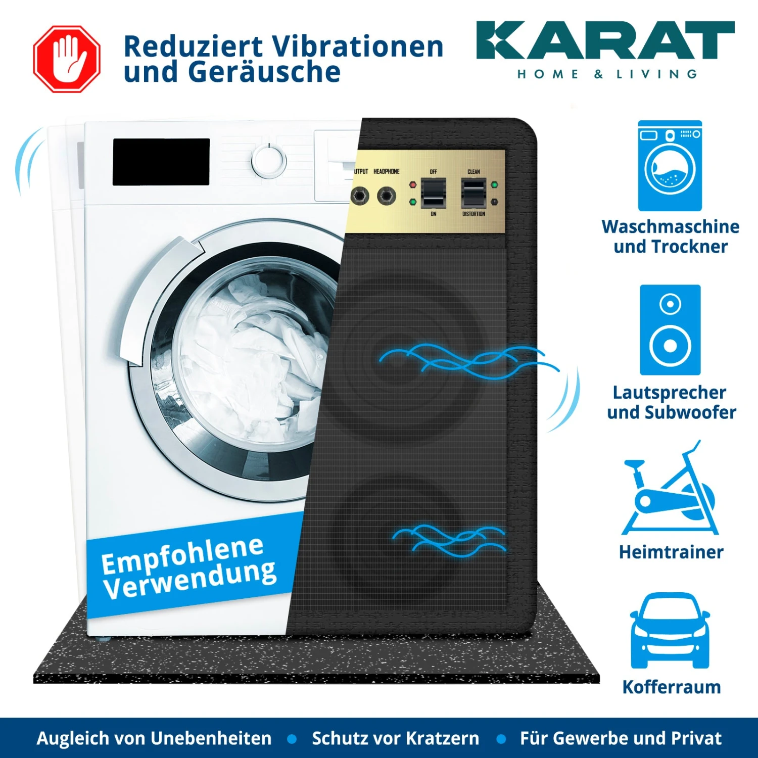 Darüber hinaus dient sie auch als Antivibrationsmatte für Waschmaschinen und Trockner, um unerwünschte Geräusche und Vibrationen zu reduzieren und Ihre Haushaltsgeräte stabil zu halten.