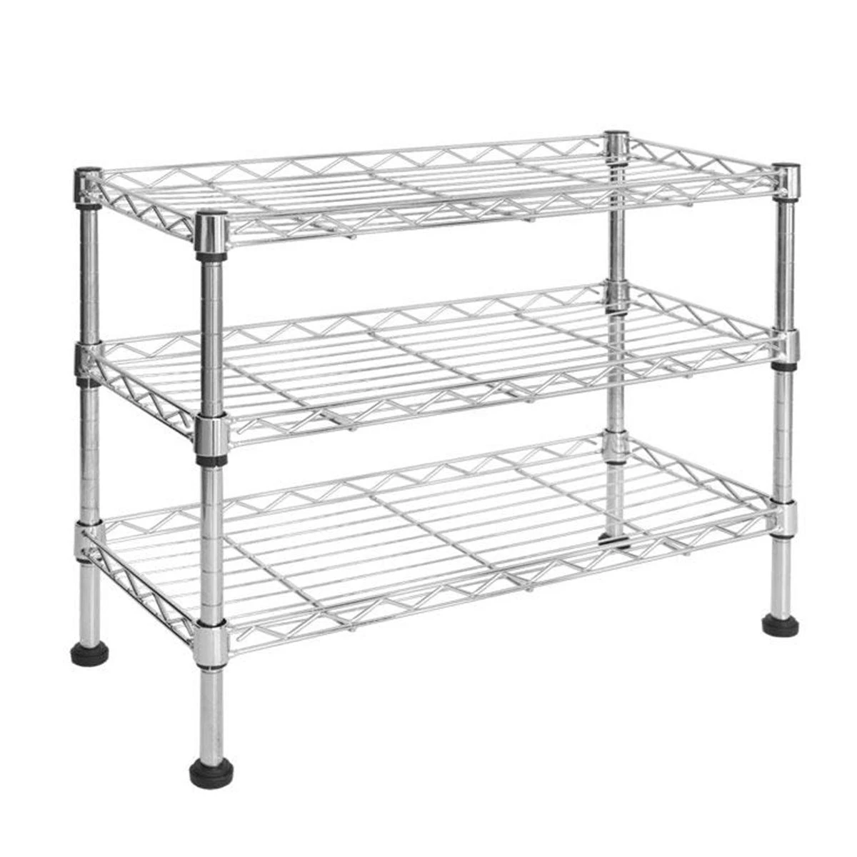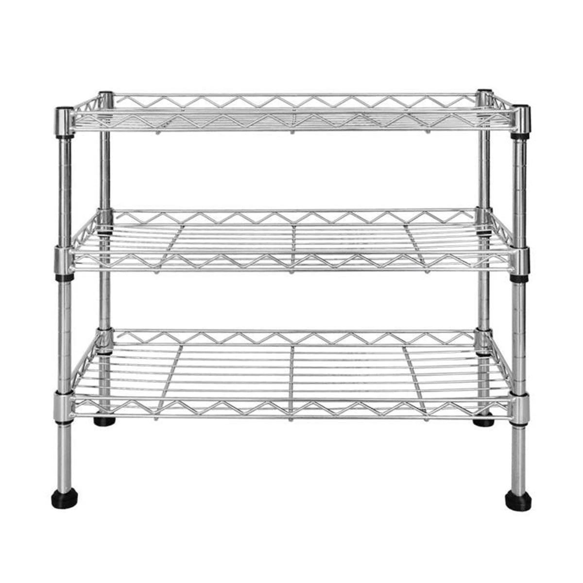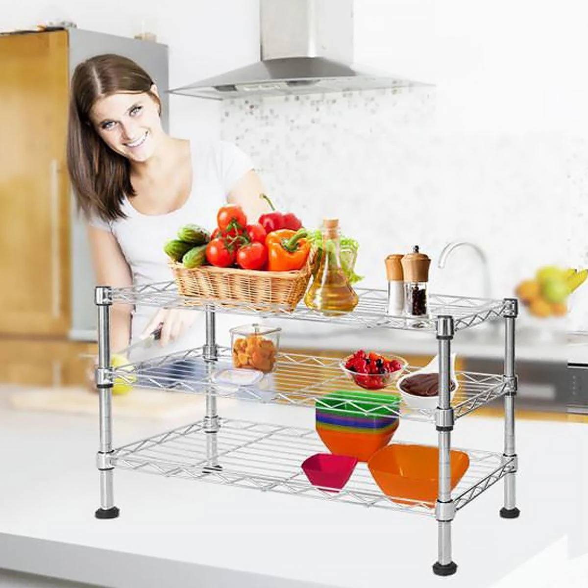 Die rutschfesten Füße sorgen für einen sicheren Stand auf glatten Oberflächen und fixeren das Küchenregal an gewünschter Stelle auf Küchenarbeitsplatten oder Küchentischen. Für ein hohes Maß an Stabilität sorgt die robuste Metall-Konstruktion des Tischregals. Die Gitterböden halten auch starker Belastung stand und können demzufolge voll beladen werden.