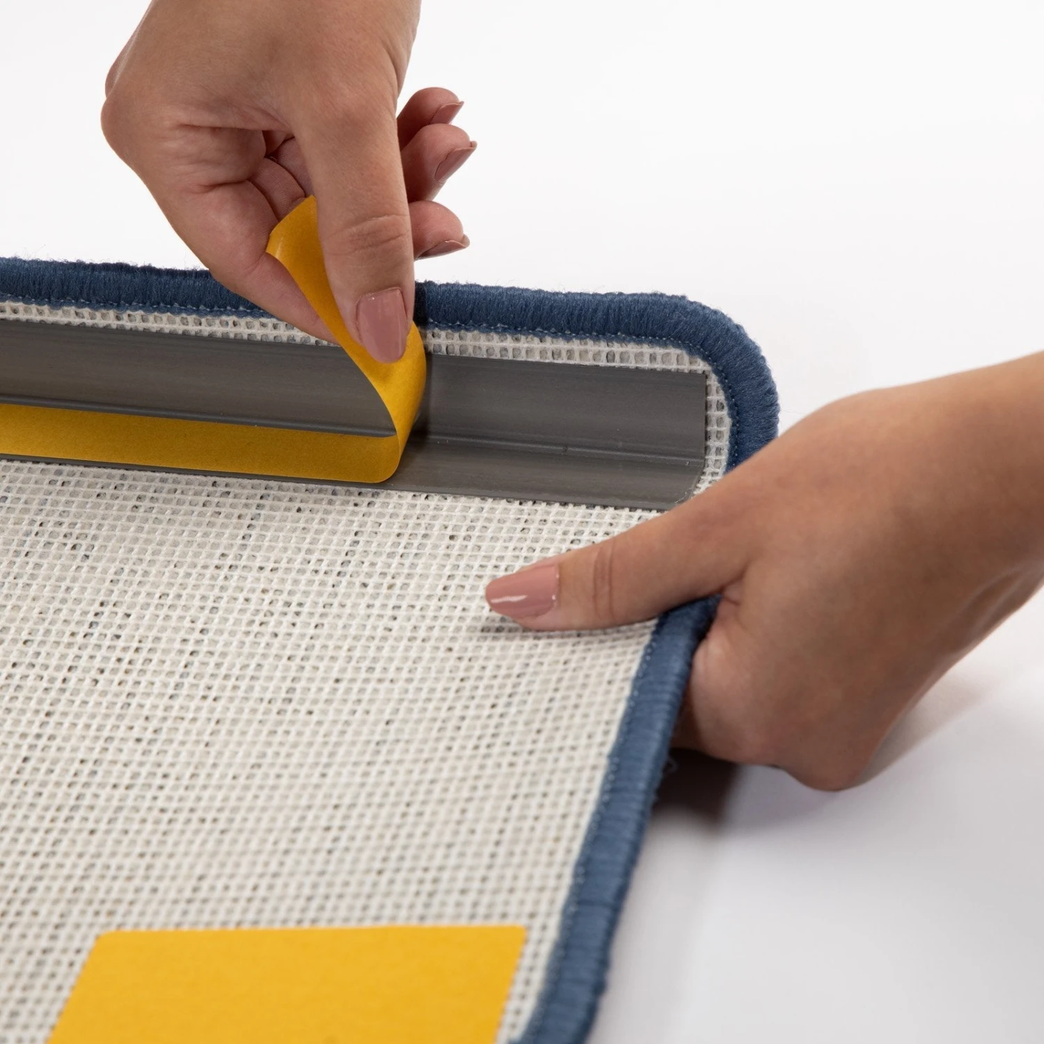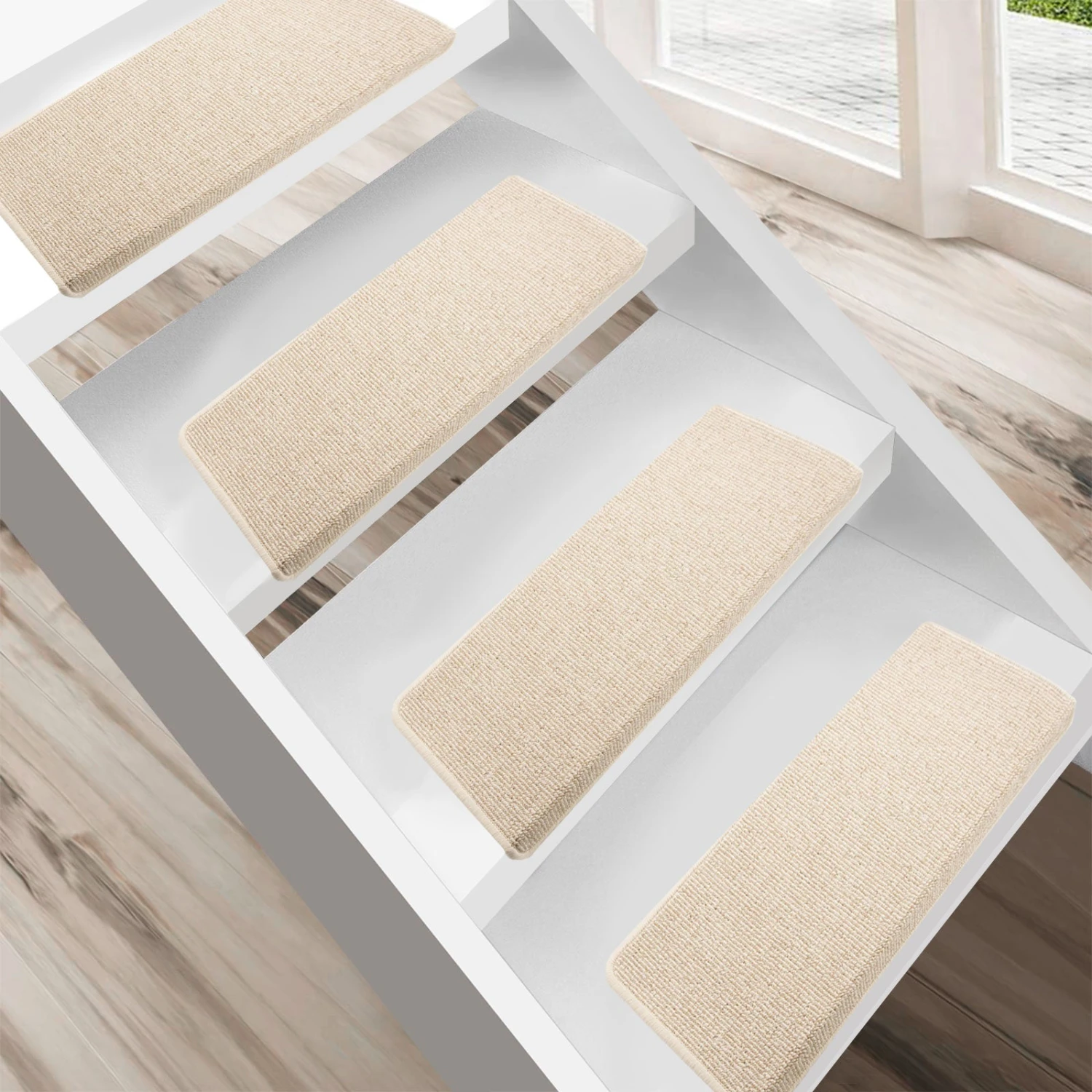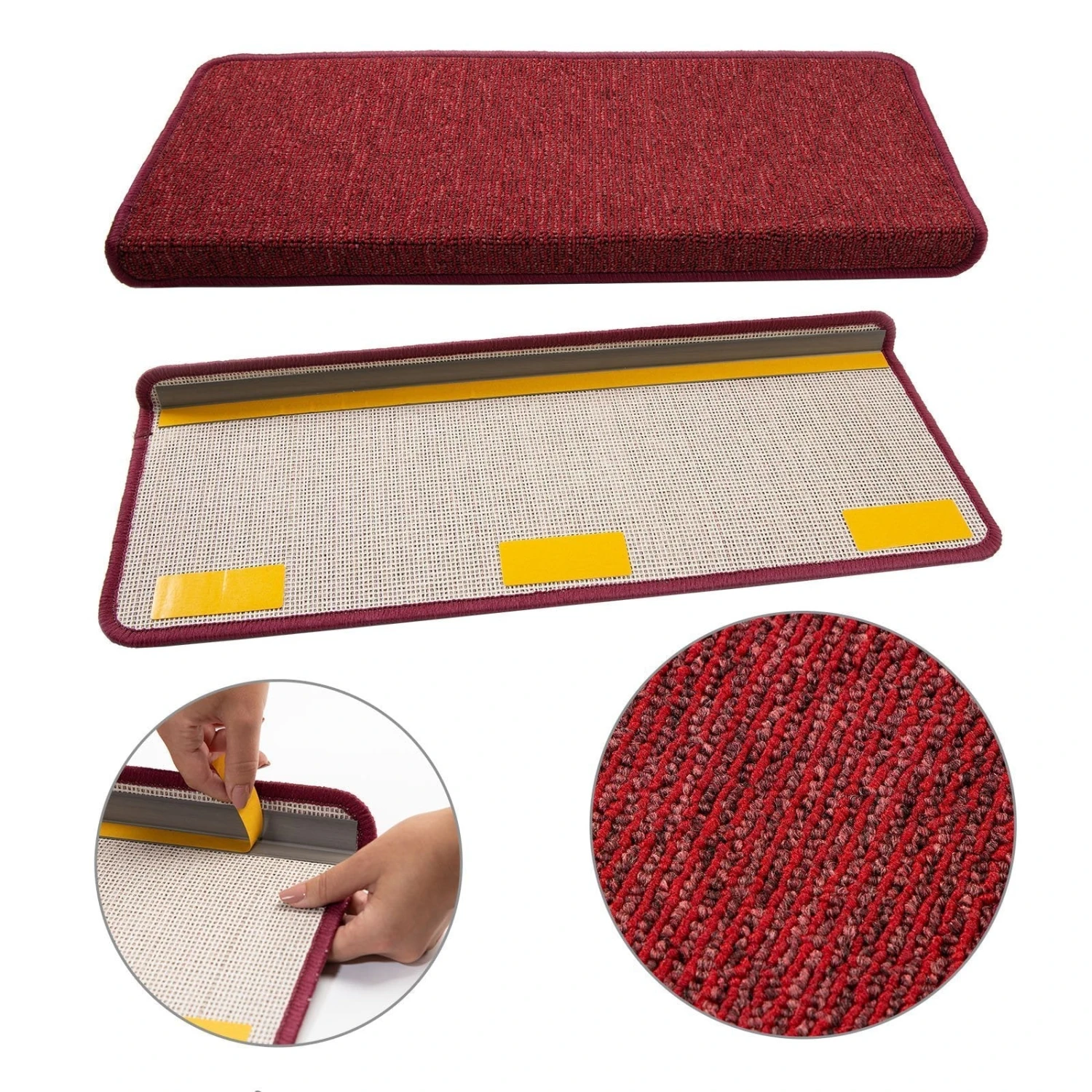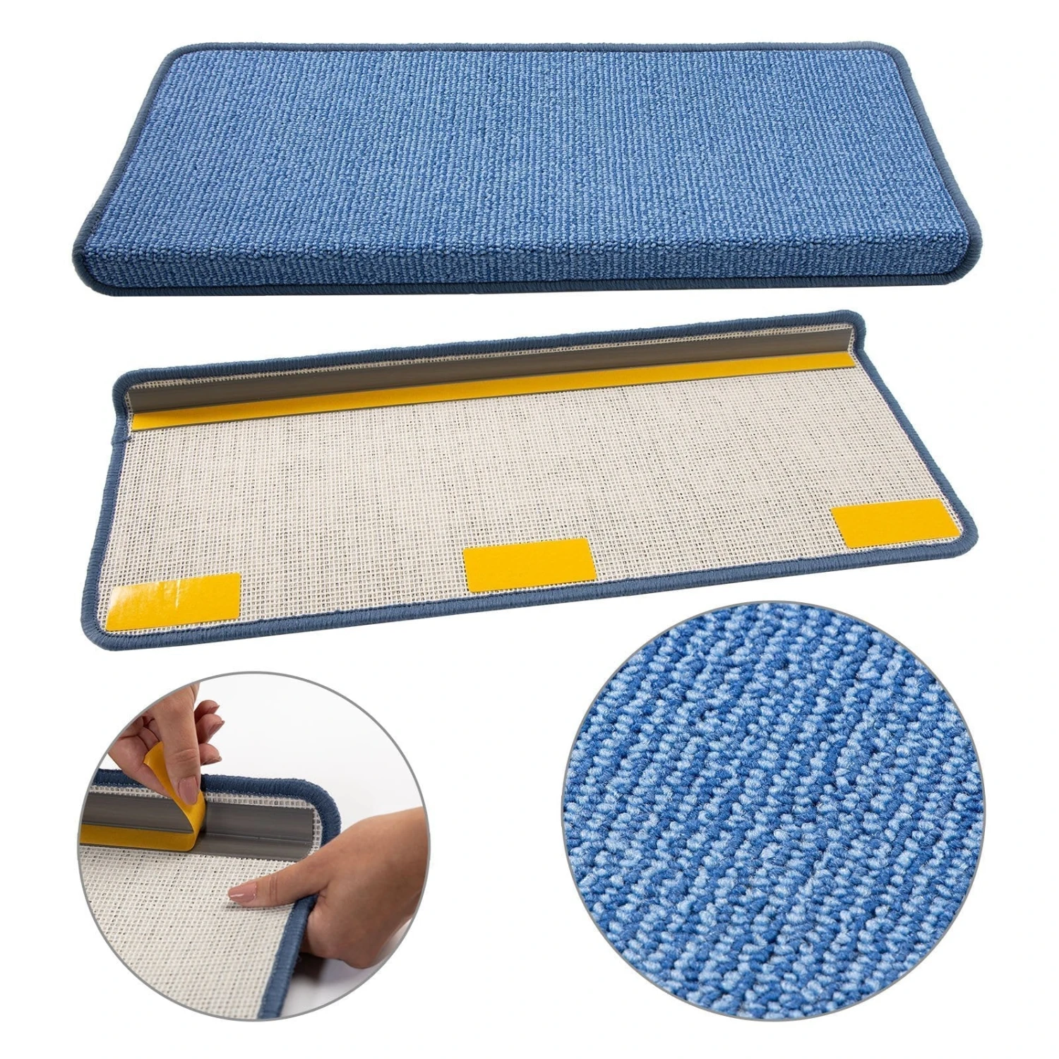 Die Stufenmatten lassen sich problemlos mithilfe des auf der Rückseite befestigten Klebewinkels und zusätzlicher Klebestreifen einfach und schnell auf den Treppenstufen anbringen. Es sollte darauf geachtet werden, dass die jeweiligen Stufen wasser- und fettfrei sind. Daher empfiehlt es sich die Treppenstufen im Vorfeld gründlich zu reinigen und von möglichen Verschmutzungen zu berfreien. Anschließend die Schutzfolie auf den Klebestreifen abziehen und jede Stufenmatte an den Treppenstufen festdrücken. Dabei darauf achten, dass der rechteckige Winkel exakt an der Stufenkante anliegt. Sollten die Stufenauflagen mal verschmutzt sein, dann können diese einfach abgesaugt werden. Stärkere Verschmutzungen können mit einem feuchten Tuch entfernt werden. Bei Bedarf zusätzlich ein geeignetes Reinigungsmittel für Teppiche verwenden.